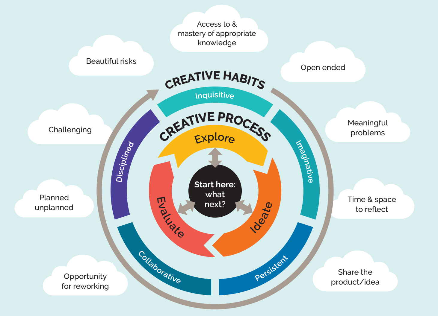 We developed the cycle of creative process stages, explore - ideate - evaluate, which is supported by selective engagement of creative habits (inquisitive, imaginative, collaborative, persistent, disciplined). For instance, collaborative habits might initially support the ‘explore’ creative process stage, by working with others to gather information to better understand a creative task. Then later support the ‘evaluate’ stage through obtaining peer feedback on an idea. The clouds signify general principles for the design of creative learning opportunities.